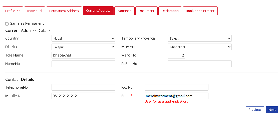In current address form, if your current address is same like permanent then tick on the same as permanent field, otherwise fill the form accordingly.