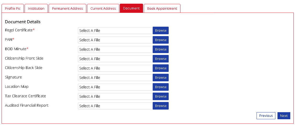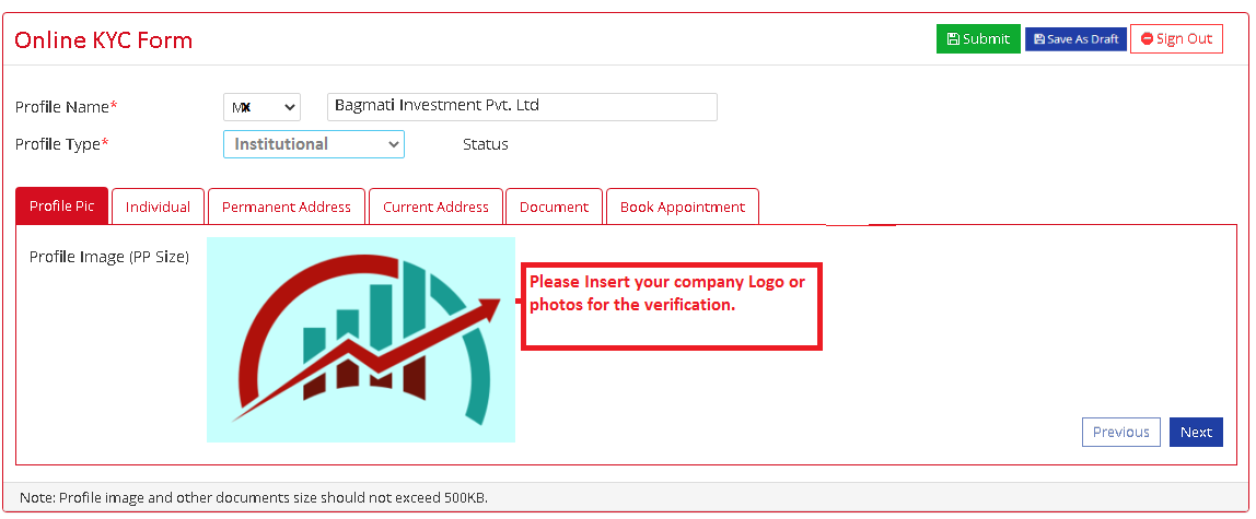 After the Login you will get the first screen of Online KYC, in this screen need to insert your organization logo or photo. After the photo, click on Next bottom for the next tab; Institutional.