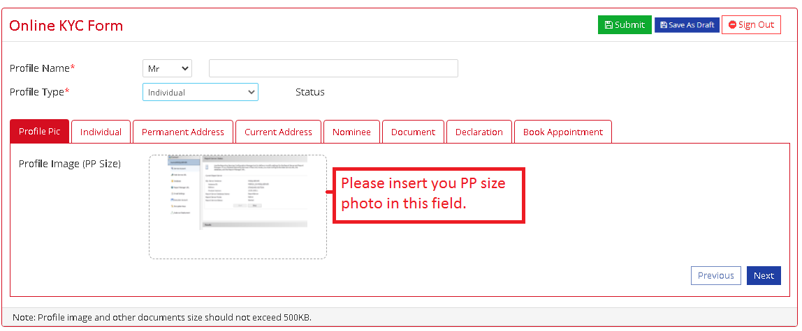 After the Login you will get the first screen of Online KYC, in this screen need to insert one recent passport size photo. After the photo, click on Next bottom for the next tab; Individual.
