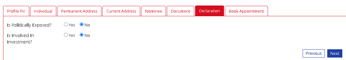 In this declaration you have to tick the two questions; are you involve with the political activities or parties and your involvement in Investment Company?